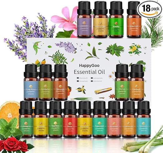 - 🌱【Exquisites ätherisches Öl-Set】 HappyGoo Aromatherapie-Set mit ätherischen Ölen enthält 18 Flaschen mit 10 ml der beliebtesten Öle, Teebaum, Lavendel, Eukalyptus, Weihrauch, Zitronengras, Rosmarin, Orange, Minze, Zitrone, Zimt, Bergamotte, Ylang-Ylang, Grapefruit, Kamille, Rose, Vanille, Patchouli, Salbei.